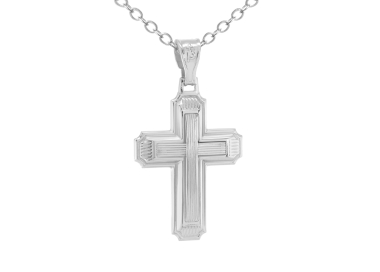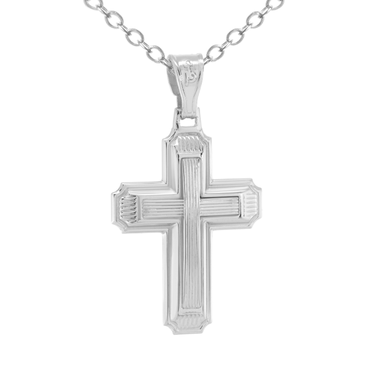 Ανδρικός λευκόχρυσος σταυρός βάπτισης από χρυσό 14 καρατίων σε λούστρε ματ φινίρισμα με γραμμώσεις σε όλη την επιφάνεια.