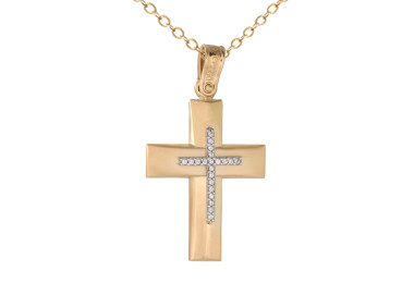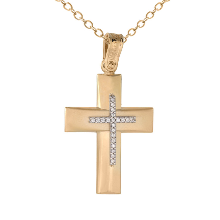 Σταυρός από χρυσό 14 καρατίων με ματ φινίρισμα στην οριζόντια πλευρά στολισμένο με λευκά ζιργκόν και λούστρε σε όλο το υπόλοιπο μέρος του κοσμήματος
