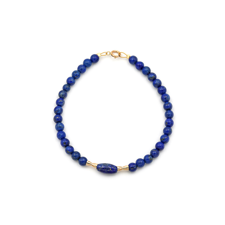 Πανέμορφο και χρωματιστό βραχιόλι από ορυκτή πέτρα λάπις συνδυασμένο με διακριτικές λεπτομέρειες από χρυσό 14 καρατίων.