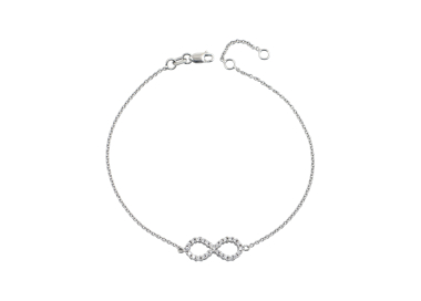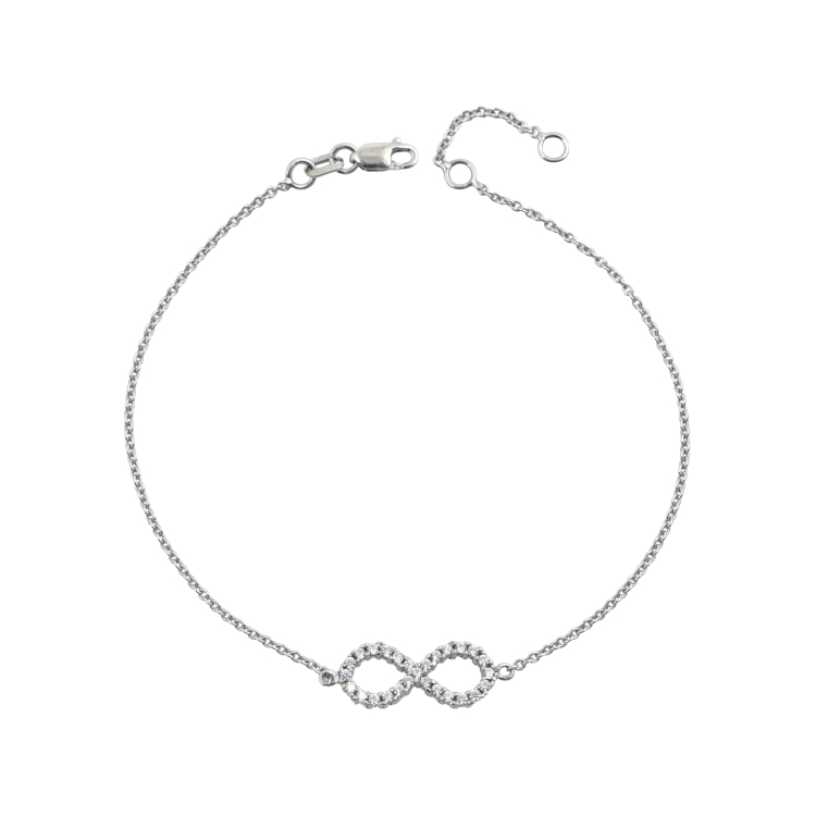 Γυναικείο βραχιόλι από λευκό χρυσό 9 καρατίων με αλυσίδα και σχέδιο άπειρο στο κέντρο δεμένο σε όλη του την επιφάνεια με διάφανες πέτρες ζιργκόν.