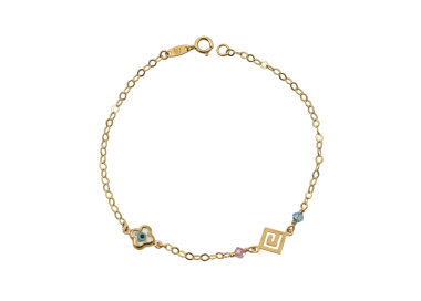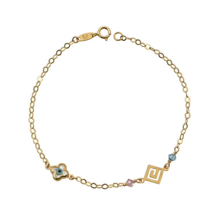 Παιδικό βραχιολάκι από χρυσό 9 καρατίων με μάτι από την μια πλευρά και ρόμβο με χαντρούλες σε ροζ και γαλάζιο χρώμα από την άλλη.