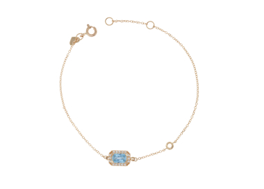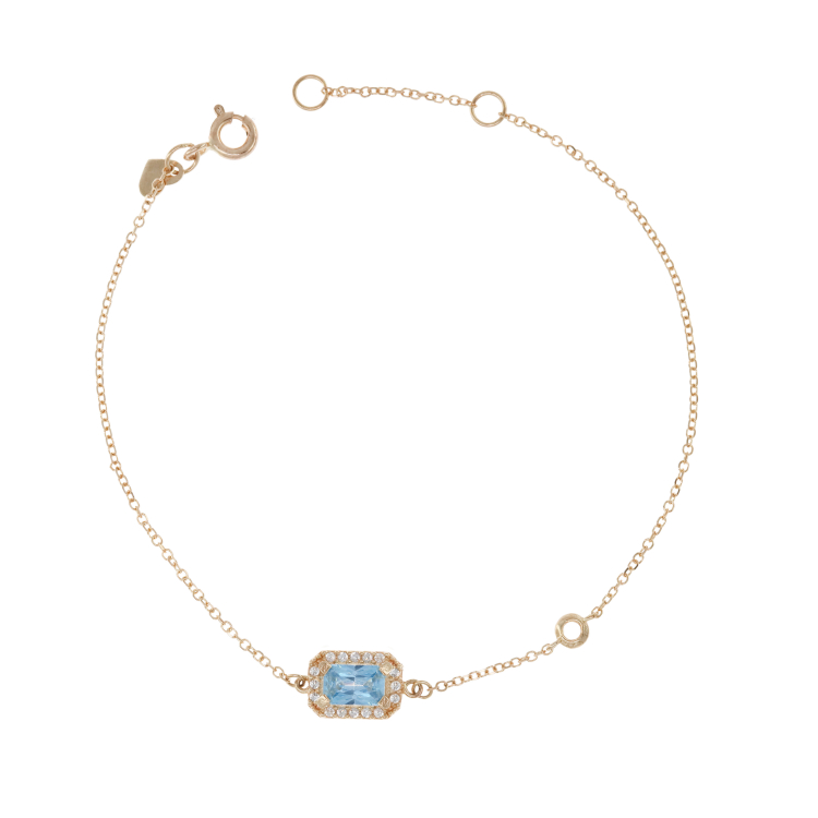 Γυναικείο βραχιόλι με ροζέτα με μεγάλη γαλάζια πέτρα με ζιργκόν περιμετρικά και άλλο ένα ζιργκόν στο πλάι .