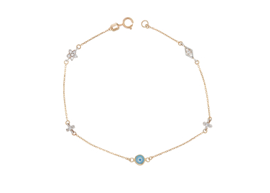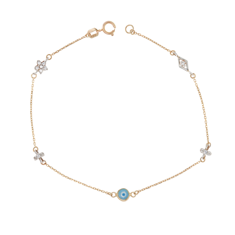 Γυναικείο βραχιόλι από χρυσό 14 καρατίων δεμένο με γαλάζιο μάτι και σχέδια δεμένα με ζιργκόν.
