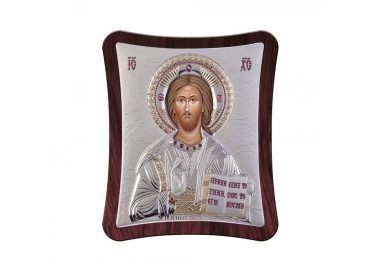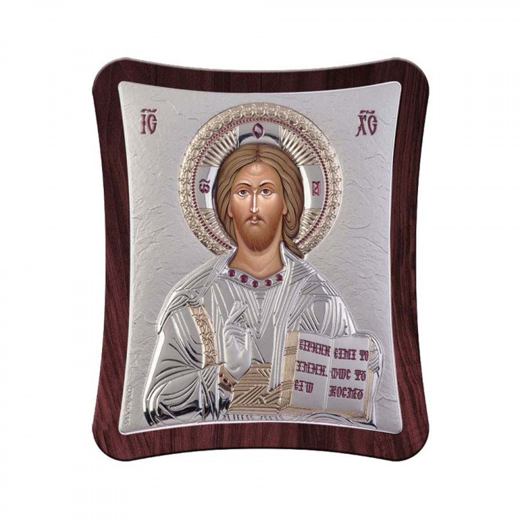 Εικόνα σε μοντέρνα γραμμή με σκούρο ξύλο και ασήμι 925. Η αναπαράσταση του Ιησού σε ασημί χρώμα με χρυσές και μπορντώ λεπτομέρειες.