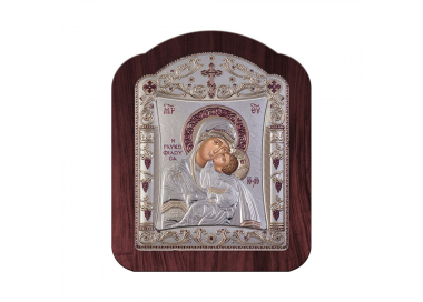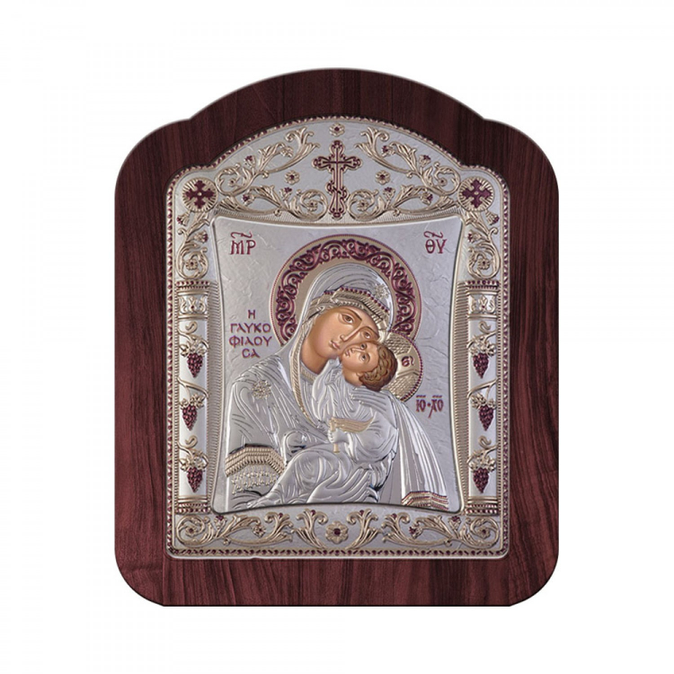 Η εικόνα της Παναγίας της γλυκοφιλούσας σε μοντέρνα γραμμή , με πλαίσιο από ξύλο και σε απόχρωση του ασημί , χρυσό και μπορντώ.