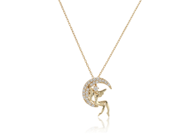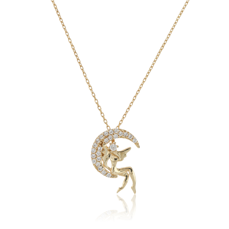 Γυναικείο κολιέ από χρυσό 14 καρατίων και μοτίφ φεγγάρι με νεράιδα δεμένο με πέτρες ζιργκόν σε λευκό χρώμα.