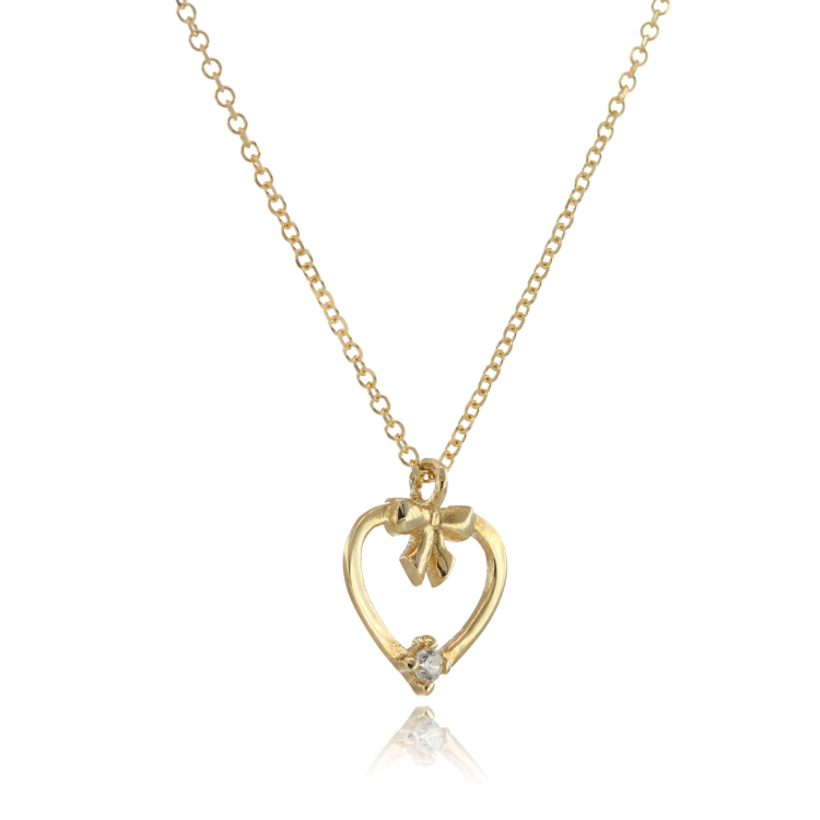 Γυναικείο κολιέ από λευκό χρυσό 14 καρατίων σε σχέδιο καρδούλα με φιόγκο στ εσωτερικό της και διάφανη πέτρα ζιργκόν.
