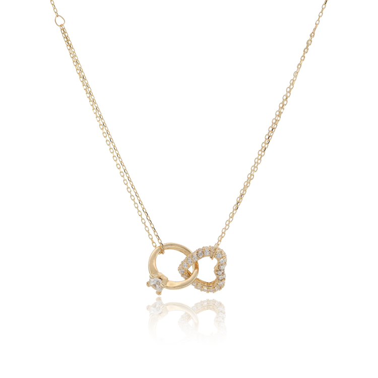 Γυναικείο κολιέ από χρυσό 14 καρατίων με διπλή αλυσίδα από την μέση και κάτω και σχέδιο μονόπετρου δαχτυλιδιού δεμένο με καρδιά από πέτρες ζιργκόν.