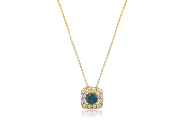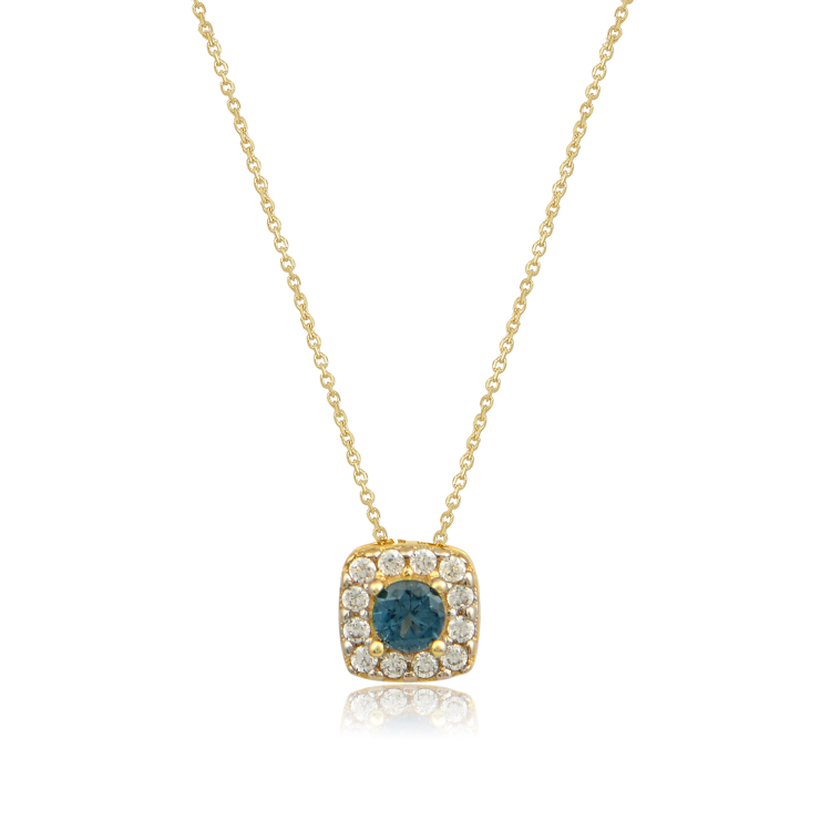Κολιέ από χρυσό 14 καρατίων με ροζέτα δεμένο με διάφανα ζιργκόν σε όλη του την επιφάνεια και στο κέντρο μπλέ πέτρα ζιργκόν. Διαστάσεις ροζέτας 5*5*3 mm.