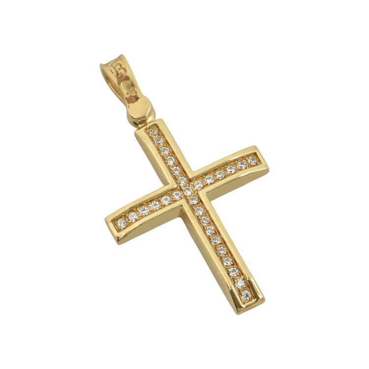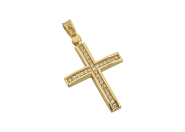 Γυναικείος σταυρός βάπτισης από χρυσό 9 καρατίων με λούστρε φινίρισμα και ζιργκόν σε όλη την επιφάνεια του σταυρού.