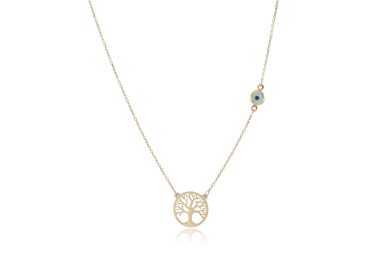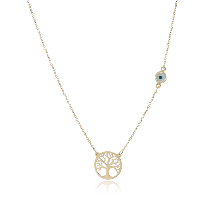 Γυναικείο κολιέ από χρυσό 14 καρατίων με μοτίφ το δέντρο της ζωής δεμένο με ματάκι σε γαλάζιο χρώμα.
