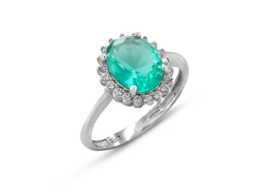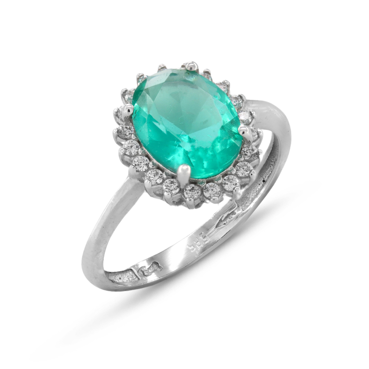 Γυναικείο δαχτυλίδι από λευκό χρυσό 14 καρατίων σε σχήμα ροζέτα με εντυπωσιακή πράσινη πέτρα στο κέντρο του και περιμετρικά λευκά ζιργκόν.