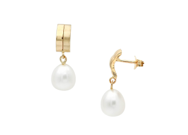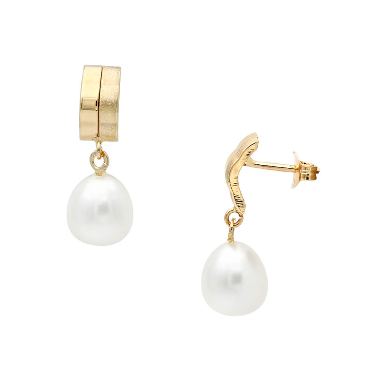 Σκουλαρίκια με λευκά μαργαριτάρια γλυκού νερού Fresh Water Pearl διαστάσεων 7,0 x 9,0 χιλιοστών σε σχήμα Drop (σταγόνα) ποιότητας ΑΑΑ. Διαθέτουν χρυσή βάση 14 καρατίων με κουμπώματα ασφαλείας.