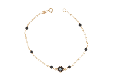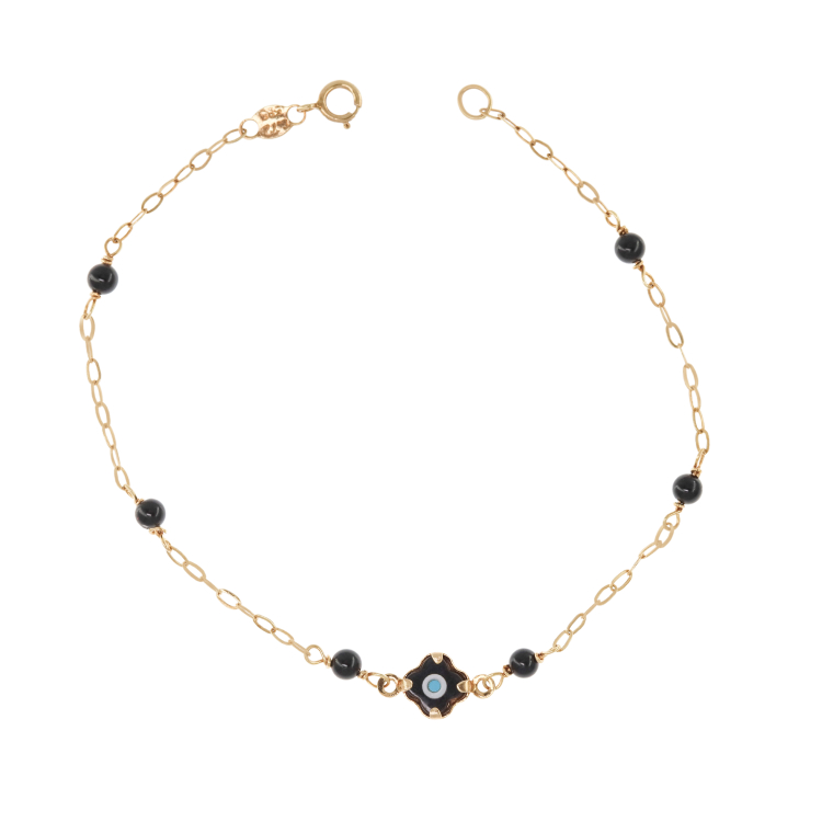 Γυναικείο βραχιόλι από χρυσό 14 καρατίων δεμένο με μαύρες χάντρες και μάτι.