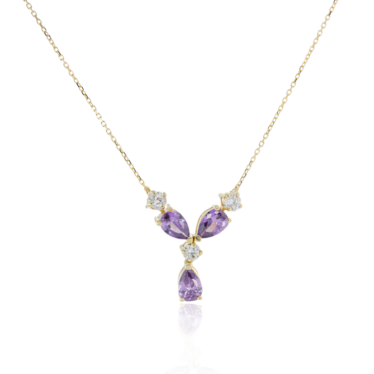 Γυναικείο κολιέ από χρυσό 14 καρατίων με μοτίφ δεμένο με πέτρες ζιργκόν σε λευκό και μωβ χρώμα.