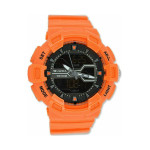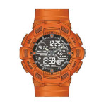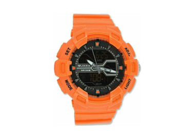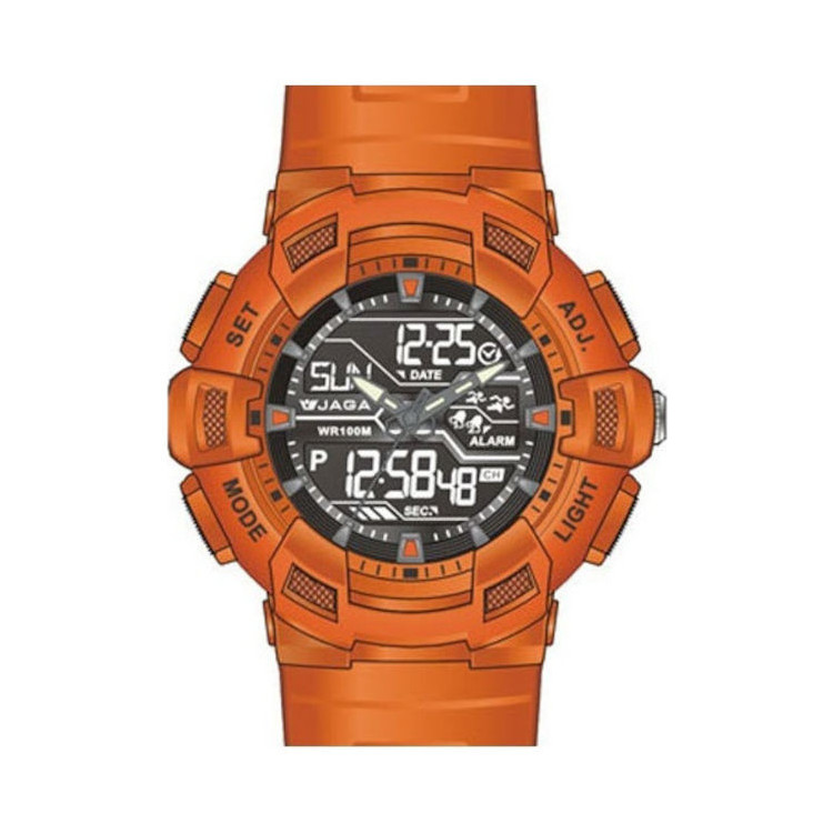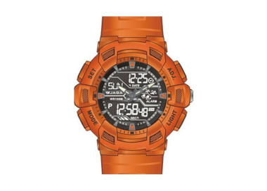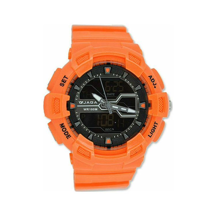 Αναλογικό-ψηφιακό ρολόι της εταιρείας Jaga σε έντονο πορτοκαλί χρώμα.