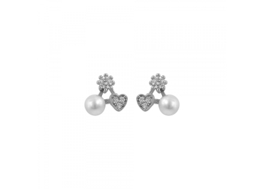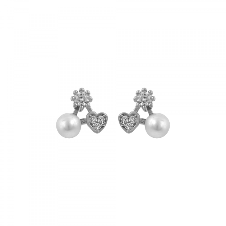 Ασημένια 925 καρφωτά σκουλαρίκια σε ένα τριγωνικό σχήμα που αποτελείτε από ζιργκόν, καρδιά και πέρλα.
