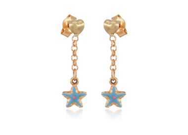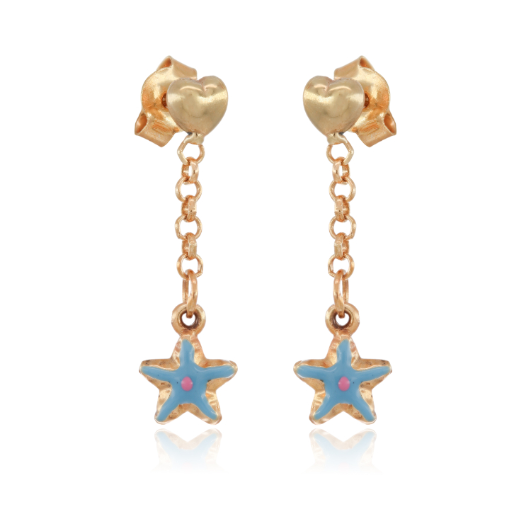 Χρωματιστά παιδικά σκουλαρίκια καρφωτά από λευκό χρυσό 14 καρατίων δεμένα με αλυσίδα και αστερίες με γαλάζιο και ροζ σμάλτο.