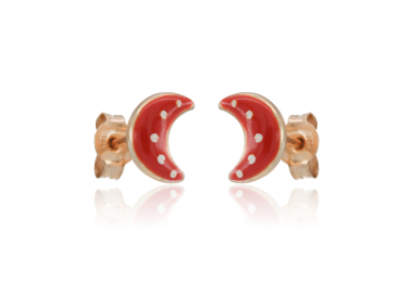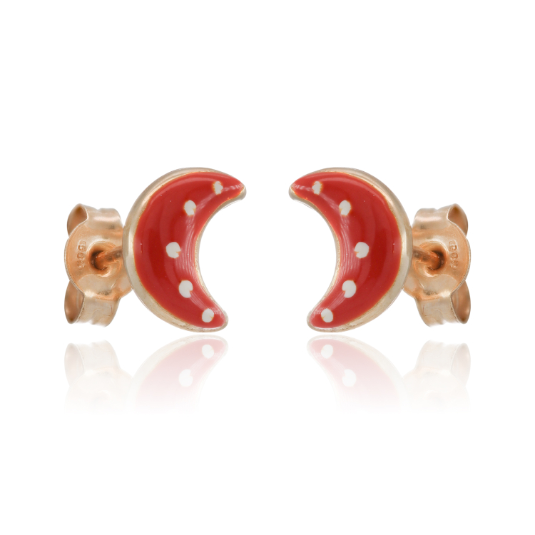 Χρωματιστά παιδικά σκουλαρίκια καρφωτά από χρυσό 14 καρατίων σε σχέδιο φεγγαράκι με κόκκινο σμάλτο άσπρες βουλίτσες.