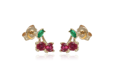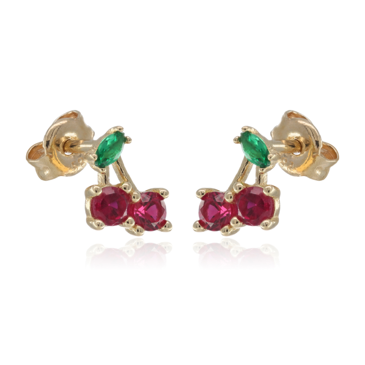 Σκουλαρίκια καρφωτά από χρυσό 14 καρατίων σε σχέδιο κερασάκια με κόκκινες και πράσινες πέτρες ζιργκόν και κούμπωμα πεταλούδα.