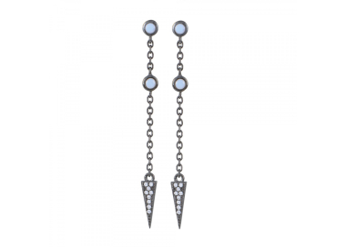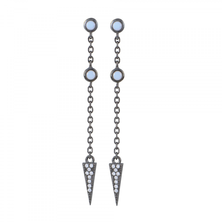 Γυναικεία μαύρα κρεμαστά σκουλαρίκια, από ασήμι 925, με στρογγυλά μοτίφ διακοσμημένα με λευκή ζιργκόν πέτρα από τα οποία κρέμεται μία αλυσίδα που στο τελείωμα της έχει διακοσμητικό σχέδιο σε τρίγωνο σχήμα με λευκές ζιργκόν πέτρες. Ένα ζευγάρι που θα ξεχωρίσει και που μπορείτε να το φοράτε σε κάθε σας εμφάνιση.