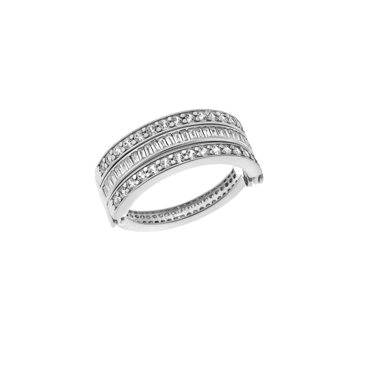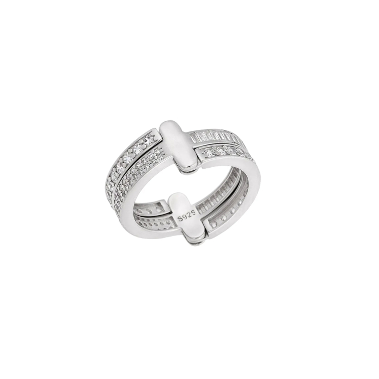 Δαχτυλίδι από ασήμι 925 δεμένο σε όλη του την επιφάνεια με διάφανες πέτρες ζιργκόν. Είναι πολυμορφικό και μπορεί να γίνει από τρία μισόβερα , δυο και ένα.