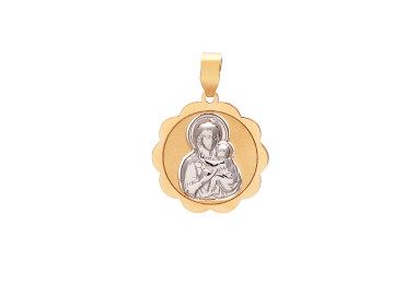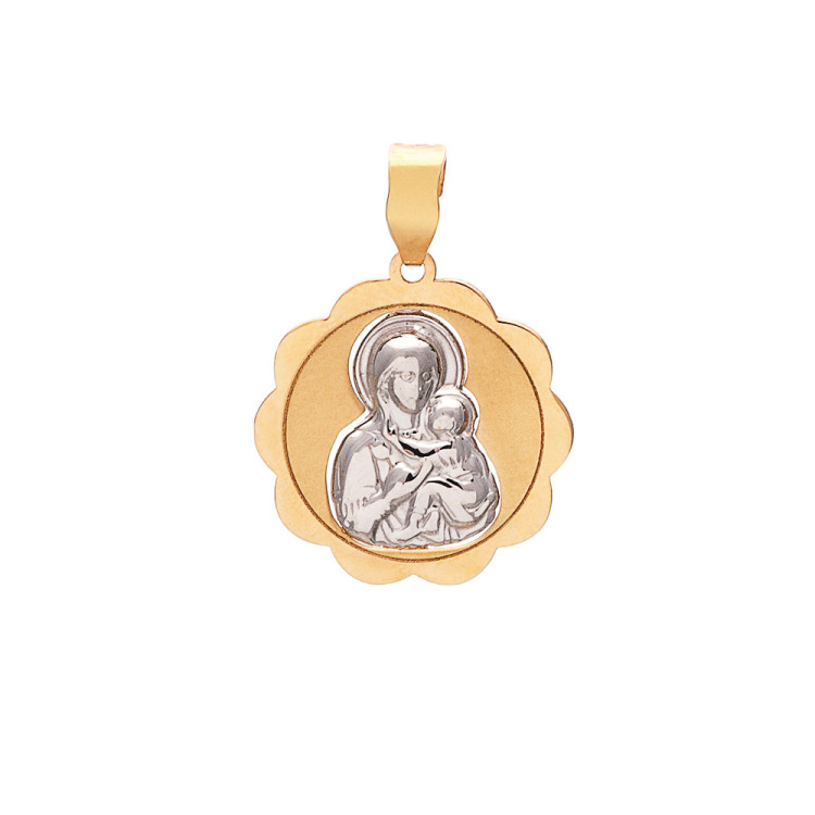 Δίχρωμο φυλαχτό μονής όψεως από χρυσό 9 καρατίων με την Παναγία και τον Χριστό .