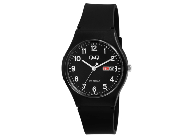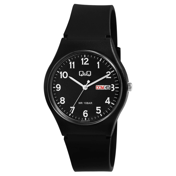 Ανδρικό αδιάβροχο ρολόι της Q&Q με μαύρο καουτσούκ ρολόι και ένδειξη ημέρας-ημερομηνίας.